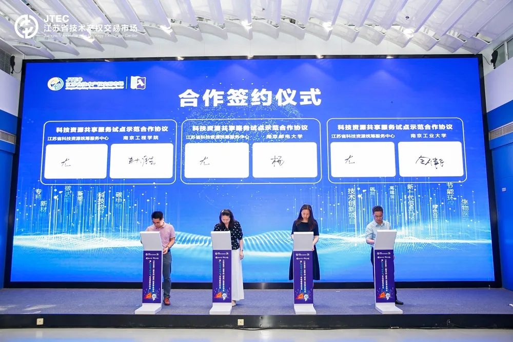 省科技資源統籌服務(wù)中心主任戴力新、淮安市科學(xué)技術(shù)局副局長(cháng)謝筱會(huì )、江陰市科學(xué)技術(shù)局局長(cháng)徐飛上臺簽約